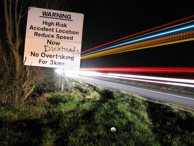 That’s the funny thing about the Irish, they just can’t stop informing ‘the’ debate, any debate. Even the use of command english in everyday life is an excuse for subversion, humour, and illumination. Take the image below. I nearly put the car in the ditch with laughter when I passed this one. how many times have I muttered ‘dickhead’ under my breath as I was cut up on the road. How many times has it been muttered at me. I’d like to raise a glass of tapwater to the person who tagged this sign. Group hug now, for all the bad drivers in Ireland, yes, we are that bad…
