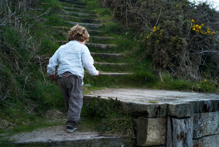 A child ascends from a beach in near Wicklow town, Co. Wicklow Ireland to the top of the cliff. Photograph Sean Dwyer