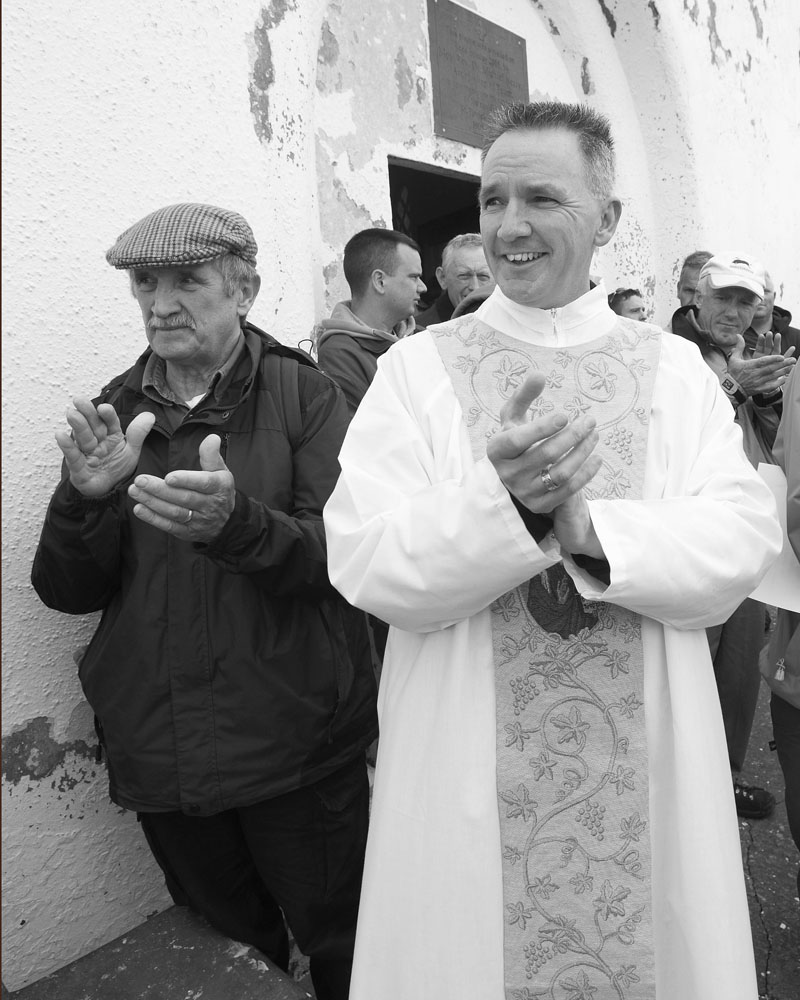 Fr. John Kenny applauds matt Loughrey’s final ascent of Croagh Patrick before he says mass on the summit. Matt Loughrey from Westport acended the mountain, Croagh Patrick, Co. Mayo Ireland today for the 365 time in succession. It was a moment of celebration, exhilaration, relief and gratitude, for Matt as his closest friends and supporters acended with him or were there for his arrival at the summit. Matt accomplished his marathon climb for the charity, Saint Vincent de Paul, raising around â¬30000. Photo Sean Dwyer